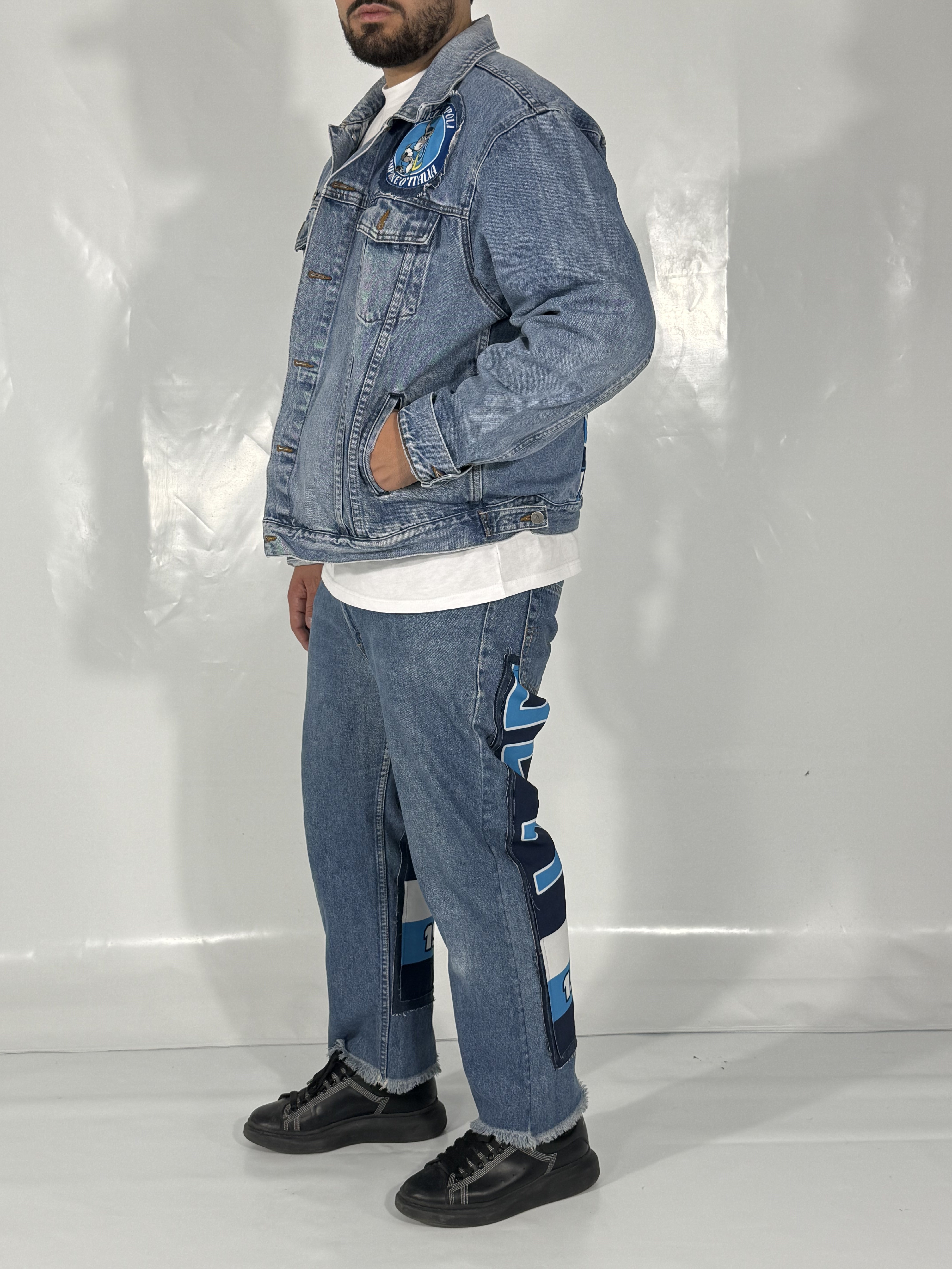 Il Tuo Orgoglio Napoli: La sciarpa, elemento chiave di questo set, è ora un dettaglio sartoriale unico cucito direttamente sui jeans.