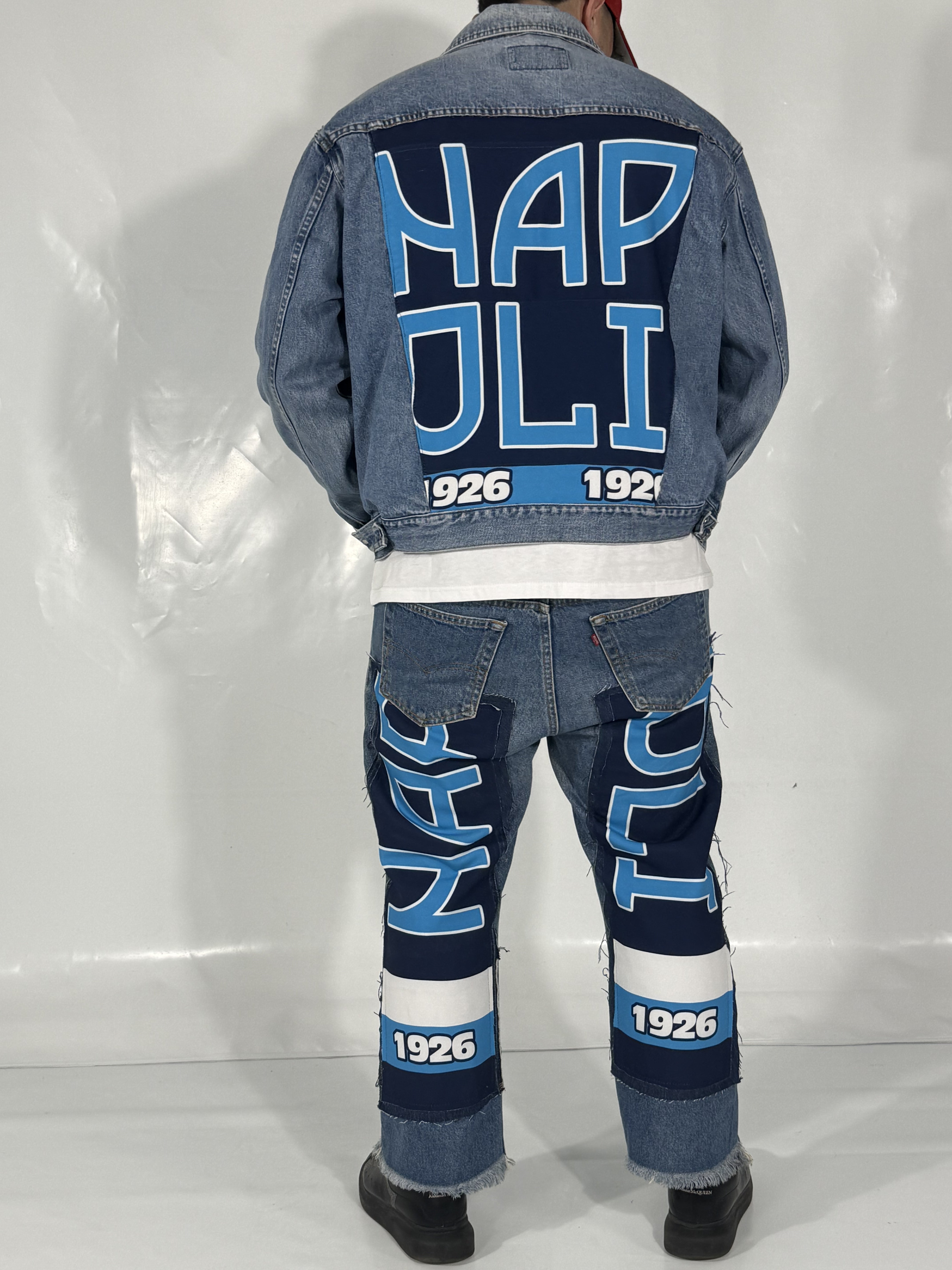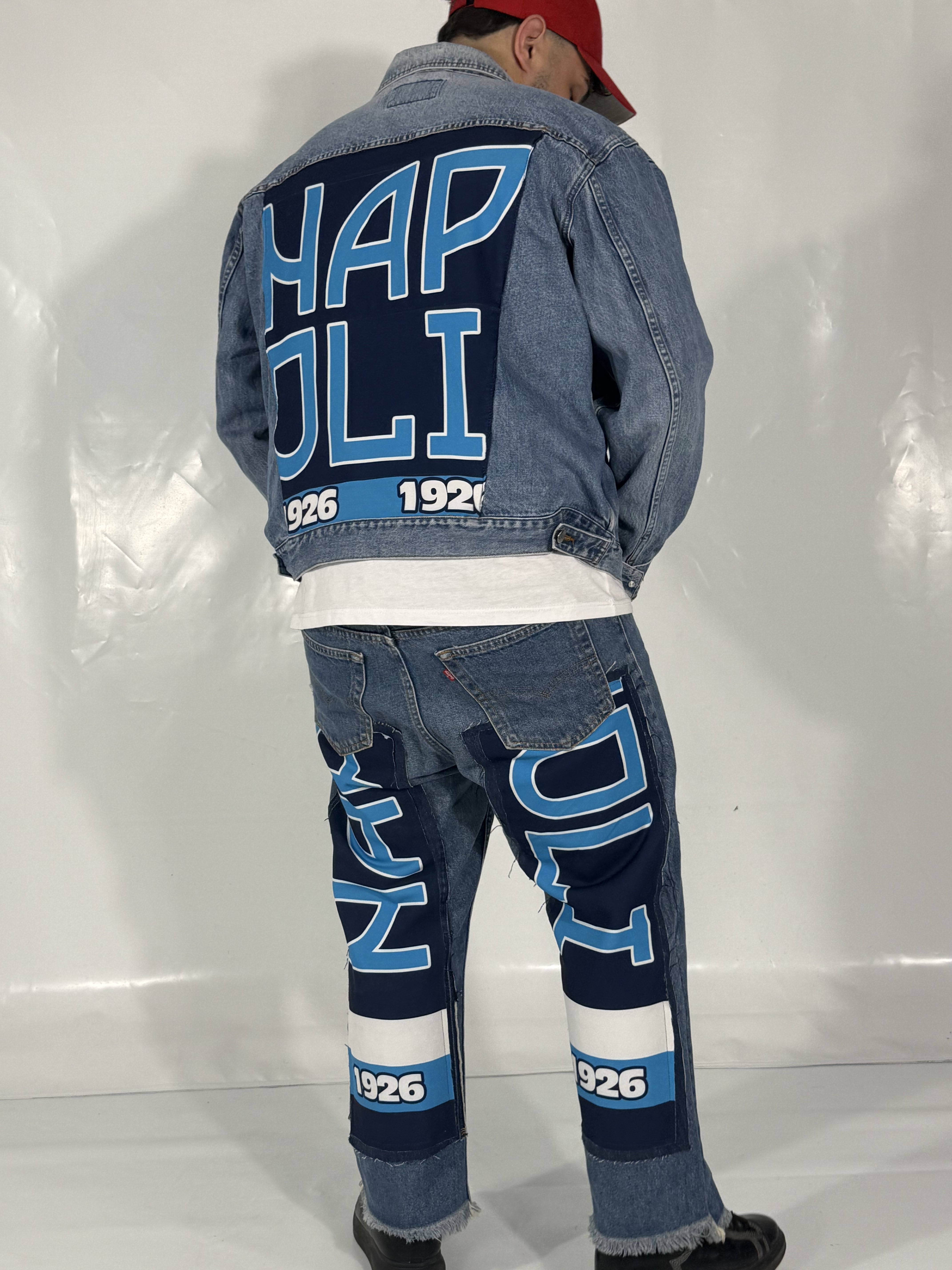 Il look perfetto per ogni tifoso, pronto da indossare! Questo esclusivo Coordinato Denim Reworked unisce la durabilità e lo stile iconico del jeans Levi's® con l'orgoglio artigianale delle nostre personalizzazioni "NAPOLI".