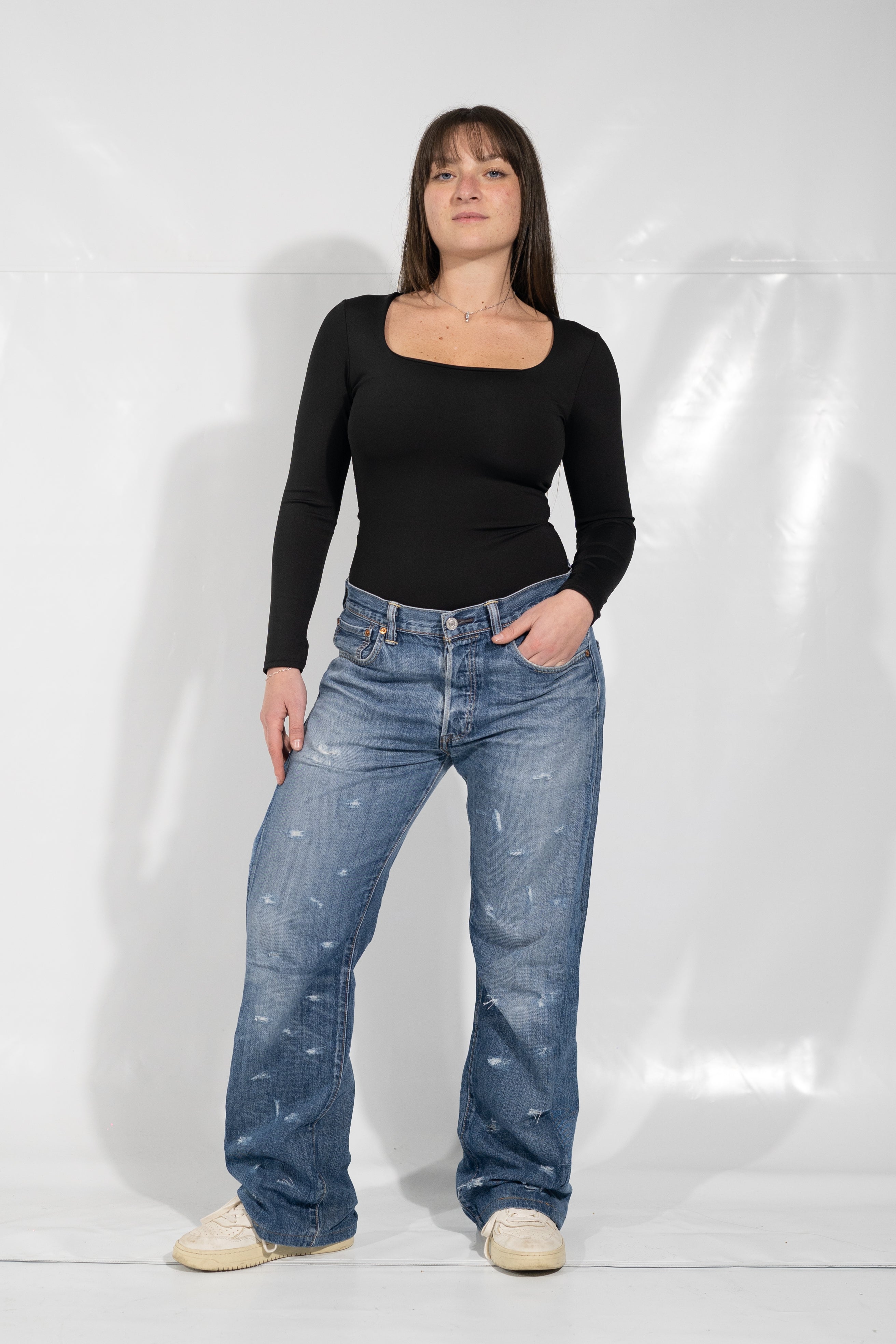 Un Levi’s vintage selezionato e trasformato attraverso interventi artigianali che valorizzano il denim originale, mantenendo equilibrio tra stile e comfort.