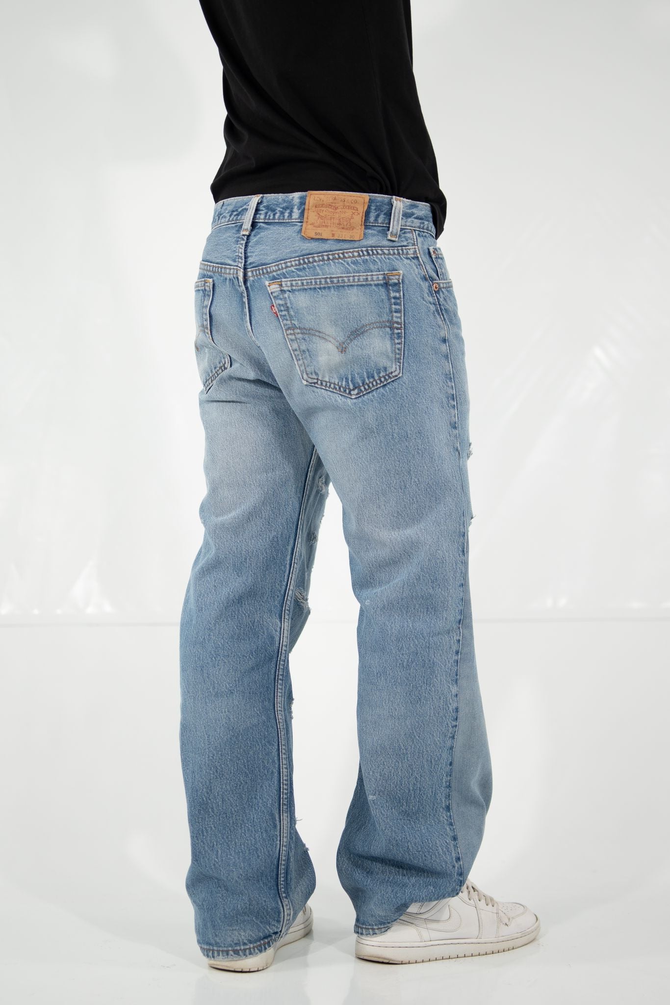 Un autentico jeans Levi’s vintage trasformato in un capo audace, dove graffi e rotture diventano segni di identità.