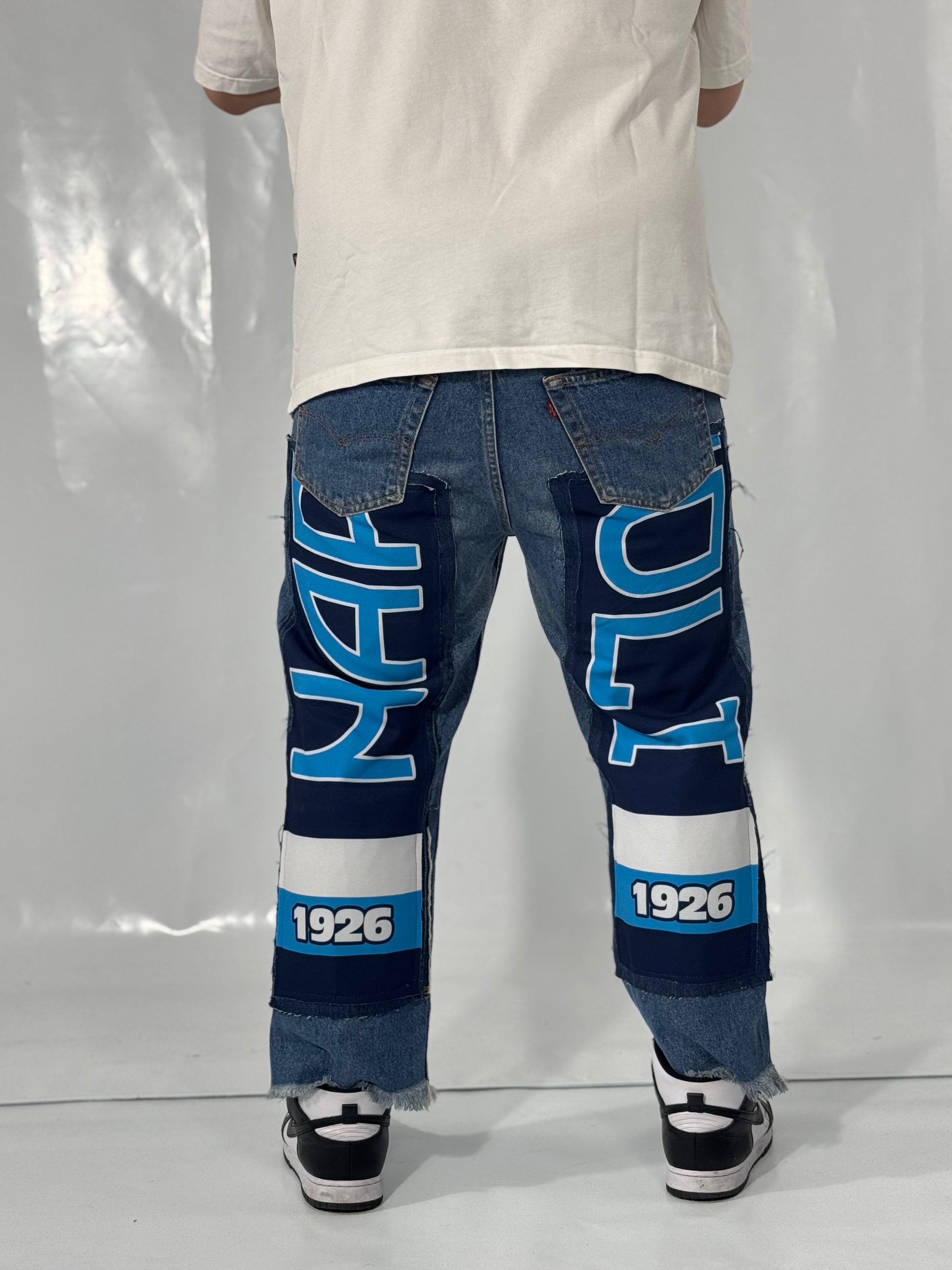 Un Capo Esclusivo della NA Collection. Questi jeans sono la tua dichiarazione di stile e di tifo. Partiamo da autentico denim Levi's® – sinonimo di vestibilità e durata – e lo trasformiamo in un capo unico con dettagli "SSC Napoli" applicati e ricamati interamente a mano.