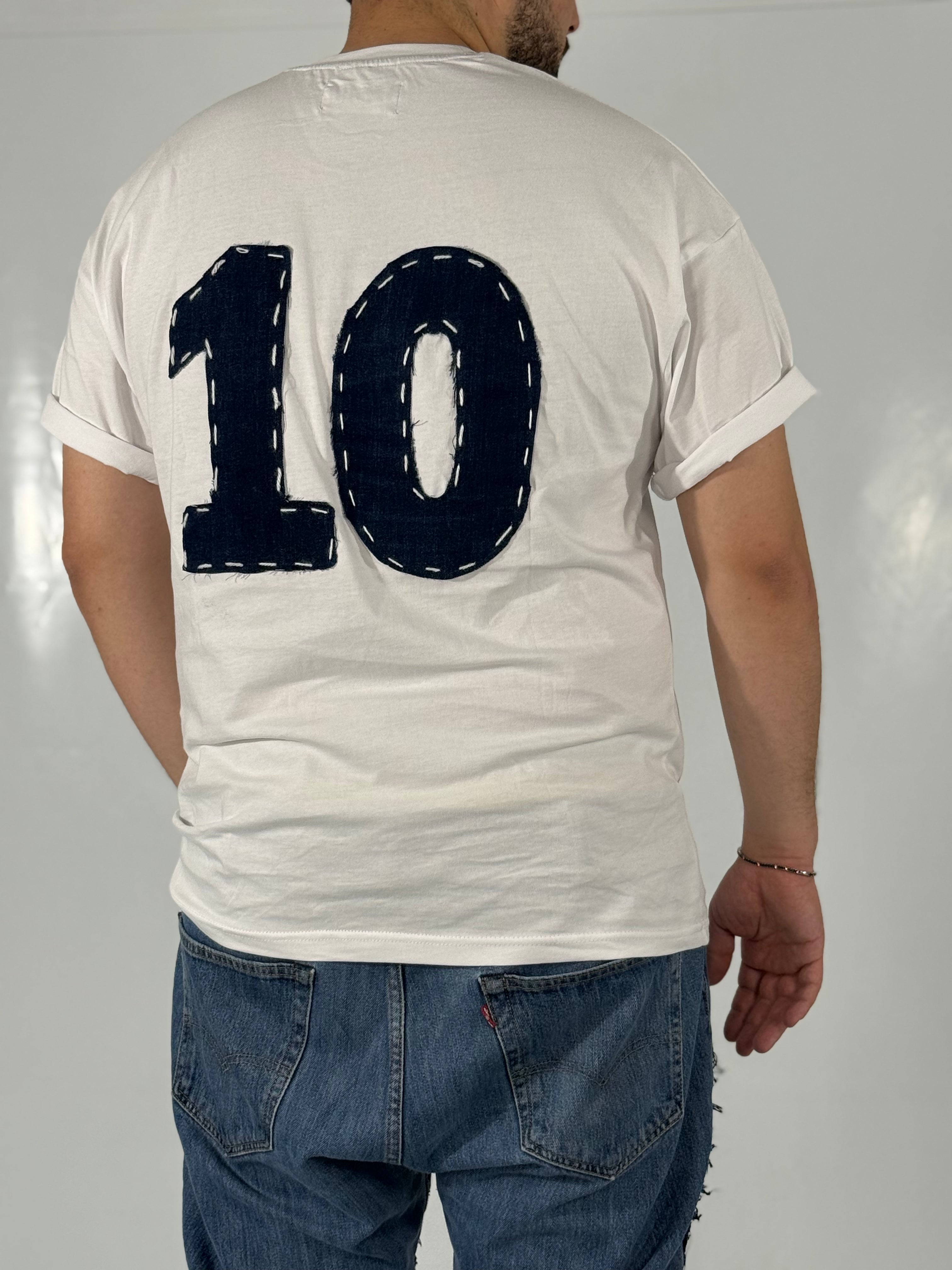 Un Capo Esclusivo della NA Collection. La T-shirt Numero 10 è il mix perfetto tra streetwear e leggenda calcistica. Realizzata con una comoda vestibilità oversize, presenta un design minimalista sul fronte e un tocco di originalità inconfondibile sul retro: il leggendario numero 10 è interamente realizzato in denim rigenerato, applicato e ricamato a mano!